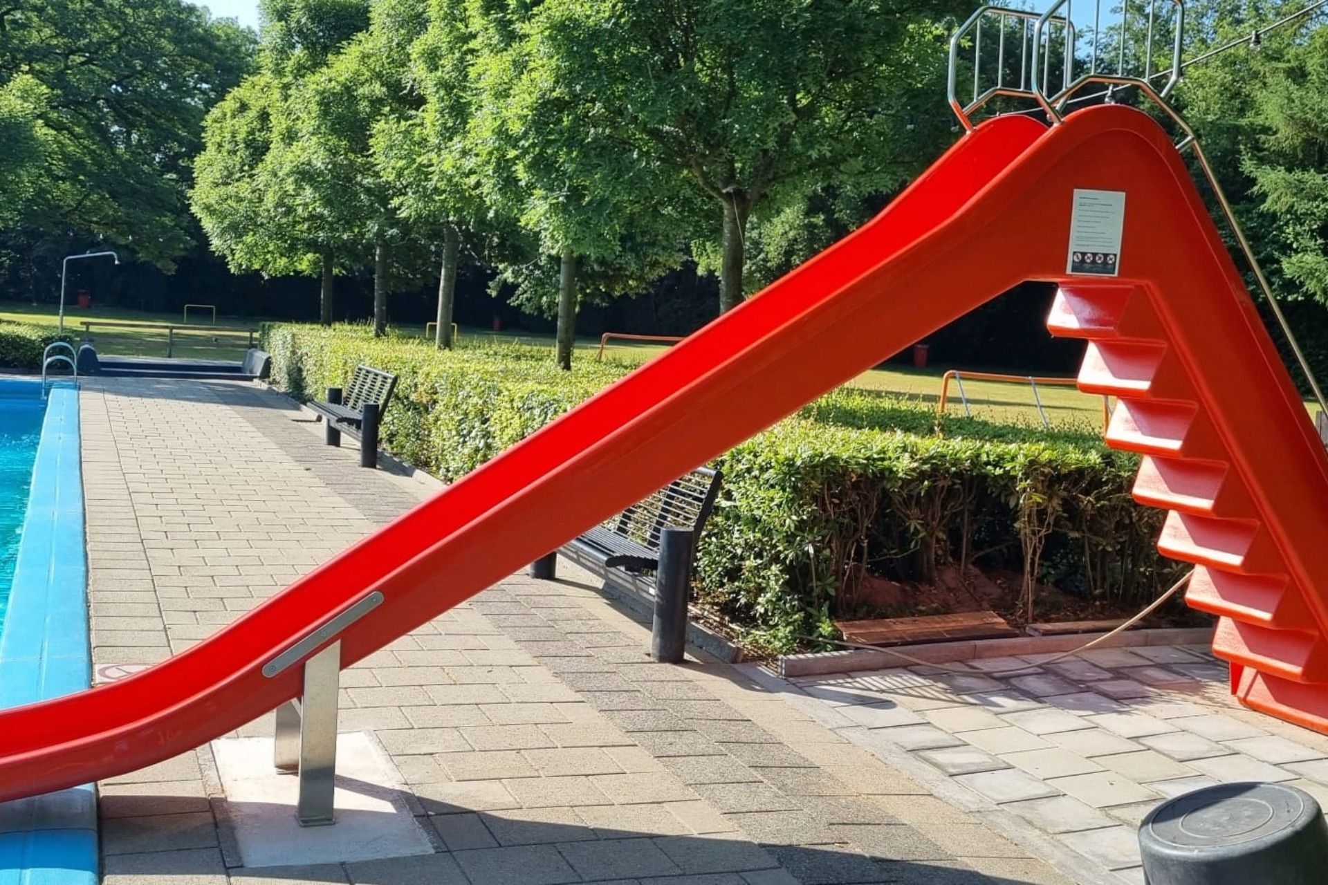 Voor de ouders staan er diverse banken om het zwembad zodat de kinderen goed in de gaten gehouden kunnen worden.